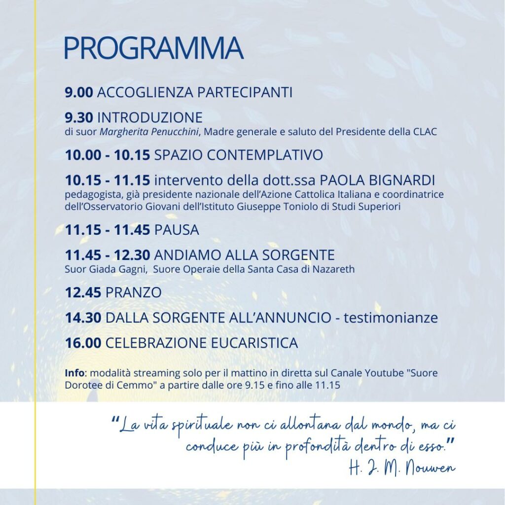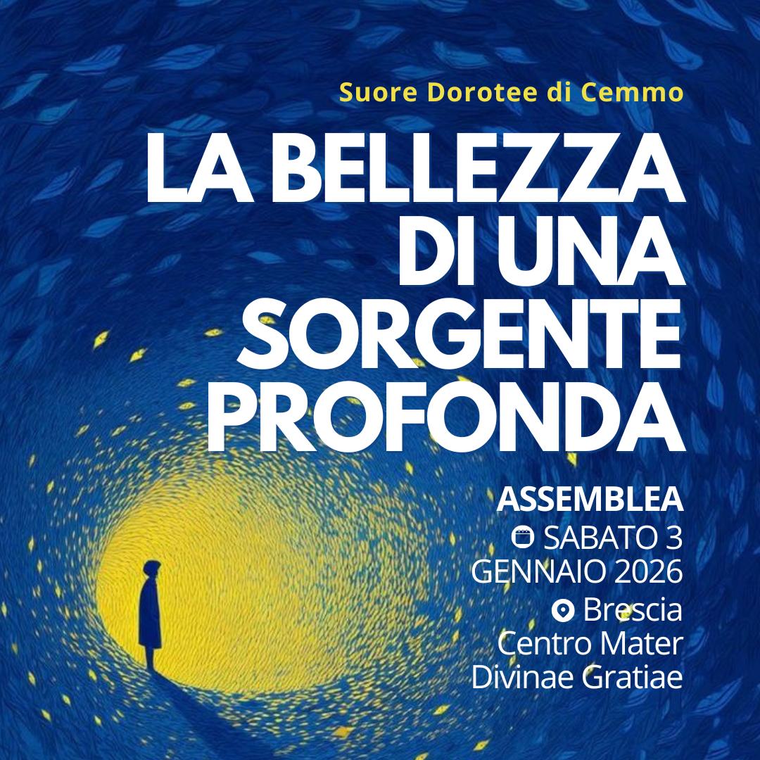 Carissimi amici e amiche il 3 gennaio 2026 avrà luogo, presso il Centro Mater Divinae Gratiae in Via Sant’Emiliano a Brescia, l’assemblea annuale d’Istituto a cui siete tutti invitati. Il tema dell’assemblea sarà “LA BELLEZZA DI UNA SORGENTE PROFONDA” secondo il seguente programma. Per informazioni e iscrizioni chiamare il numero di tel. 030/384721 e chiedere di sr. Cati Pintossi.